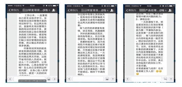 杨老师知识渊博,见识独到,很多地方都一针见血地指出他们的痛点,结合教材内容以及亲身经历为学员指明方向,也为项目经理和产品经理分别理清了他们工作中的思路。两天课程结束了,本次系列课成还未完结,但学员都在老师的教导下掌握了pest分析 swot分析等等实用方法,会结合自身产品实际制定有用的项目计划、学会到底应该如何做市场……虽然是周六周日的课程,但学员们的热情丝毫不减,在课程结束时也纷纷在课程的微信群中表示出对老师的敬佩与喜爱,对中天华夏的信任。
