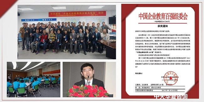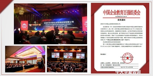 \r\n\r\n本届中国企业教育百强组委会,通过对中天华夏公司的多方考察、评审,再次证实了中天华夏公司在继2014年之后的三年时间内,无论是从顾问团队的专业性还是咨询培训的系统性以及服务的务实性,确实已经是产品创新及研发管理领域最专业、最优秀的咨询培训机构。遂授予中天华夏公司“中国企业培训最佳服务商20强”荣誉称号。这也证实了一句话:努力不一定成功,成功一定要努力!